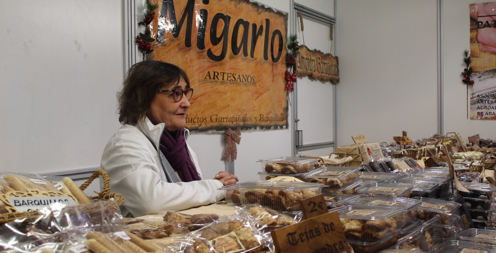 Más allá de rencillas por la denominación, asegura que este queso "se vende muy bien", y no es de extrañar después de probar la muestra que ofrecen en el puesto para que los viandantes lo caten. Entre cliente y cliente, Rosa Blanca aprovecha para charlar con Soledad Hernández, que vende en el puesto de Migarlo. Esta panadería, originaria de la Puebla de Alfindén, está especializada en los garrapiñados, barquillos y tejas.