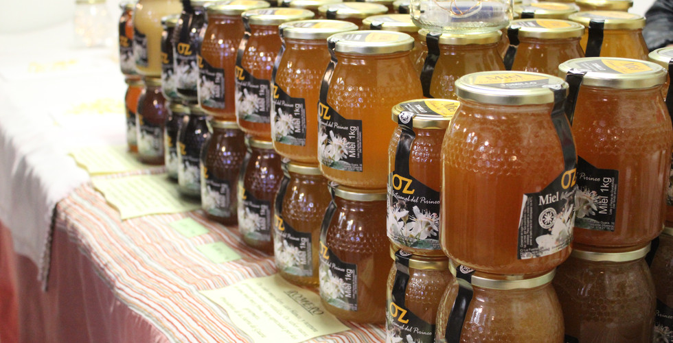 Entre todos estos puestos, no podían faltar los de alimentación. Doce casetas están reservadas a productores de artesanía alimentaria, una ocasión para conocer más de cerca el producto de la tierra y a los artesanos detrás de ellos. Es el caso de Miel de Oz, en el que Rosa Blanca López-Blanco vende miel y productos derivados procedentes del Pirineo aragonés. "Tenemos más de mil colmenas repartidas entre Sierra de Guara, Valle de Tena, Benasque, Canfranc..., parte de nuestras colmenas están en la reserva de la biosfera de Ordesa-Viñamala, y cada zona nos da una flora que nos permite sacar distintos matices en nuestras mieles", explica la vendedora.